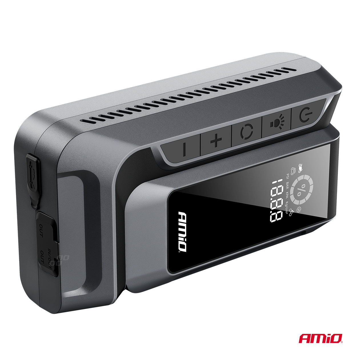 Amio Amio – Φορητός Εκκινητής Μπαταρίας (Jump Starter) 4 σε 1 με ενσωματωμένο Κομπρεσέρ Αέρα, Powerbank και Φακό LED τάση λειτουργίας 12V με χωρητικότητα 12Ah και μέγιστο ρεύμα εκκίνησης 1600A για Επιβατικά Αυτοκίνητα – 1 τεμ. (04677/AM)
